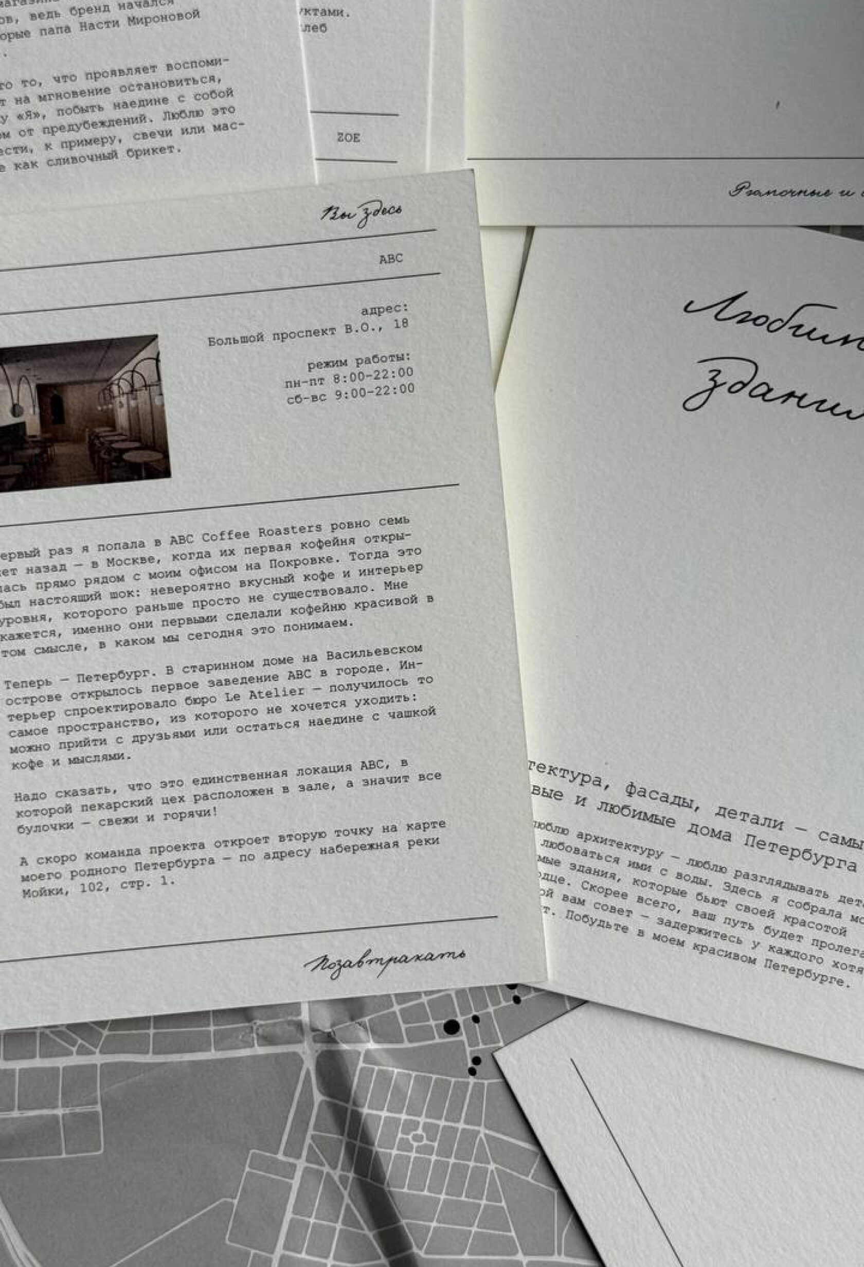 Печатный гайд для прогулок по Петербургу, оформленный в открытки и завернутый в карту города, которую мы нарисовали сами, с отмеченными на ней «кляксами-местами». Дополнено денежными резинками (да, к деньгам!) и микро-карандашом с фирменной надписью «понимаешь о чем я».