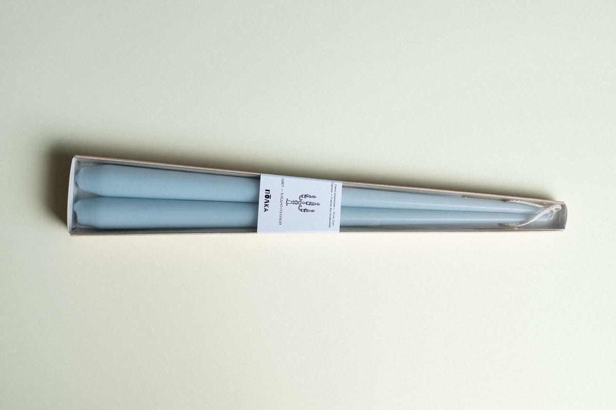 Пара бледно-голубых свечей 35 см упакованы в дизайнерскую коробку из крафт картона с прозрачной пластиковой крышкой и наклейкой. Внимательно прочтите инструкцию на обратной стороне коробки перед использованием.