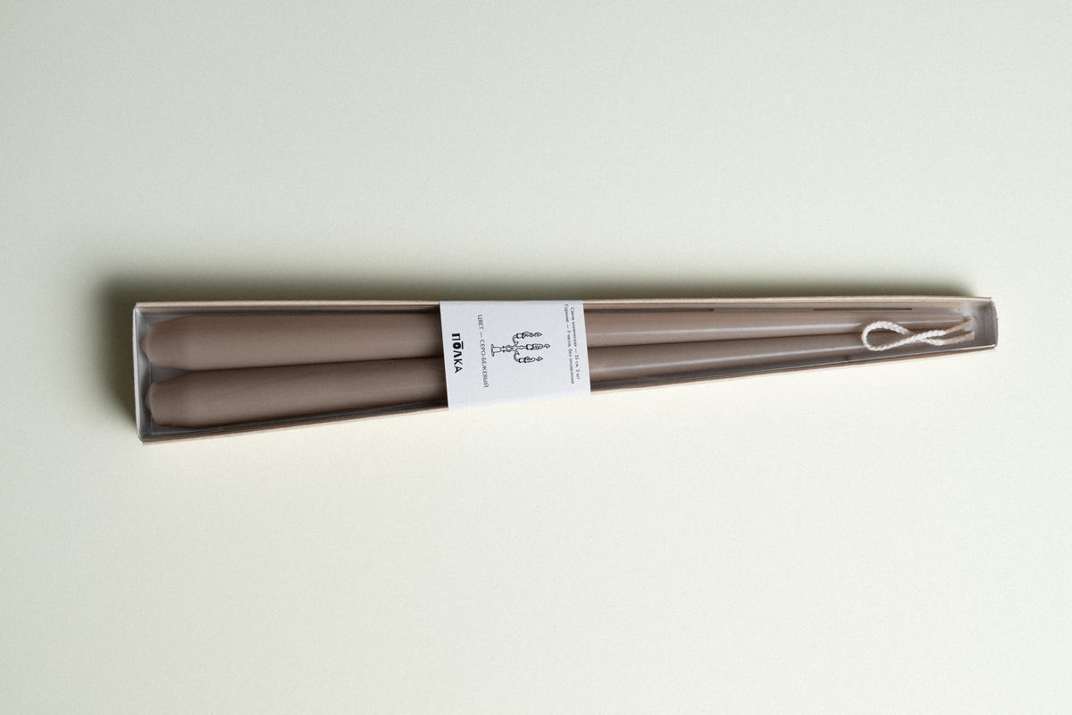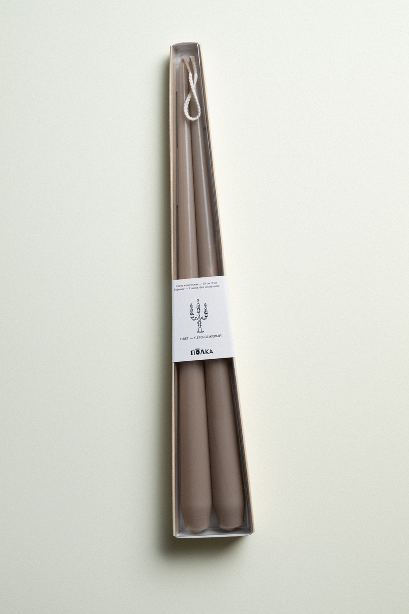 Пара серо-бежевых свечей 35 см упакованы в дизайнерскую коробку из крафт картона с прозрачной пластиковой крышкой и наклейкой. Внимательно прочтите инструкцию на обратной стороне коробки перед использованием.