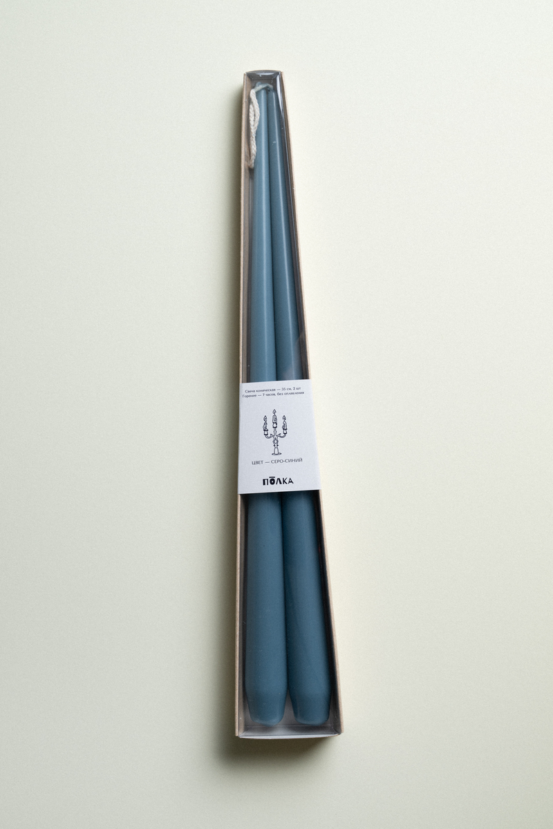 Пара серо-синих свечей 35 см упакованы в дизайнерскую коробку из крафт картона с прозрачной пластиковой крышкой и наклейкой. Внимательно прочтите инструкцию на обратной стороне коробки перед использованием.