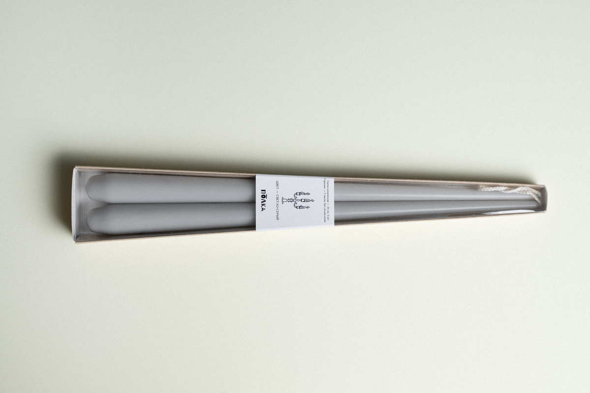 Пара светло-серых свечей 35 см упакованы в дизайнерскую коробку из крафт картона с прозрачной пластиковой крышкой и наклейкой. Внимательно прочтите инструкцию на обратной стороне коробки перед использованием.