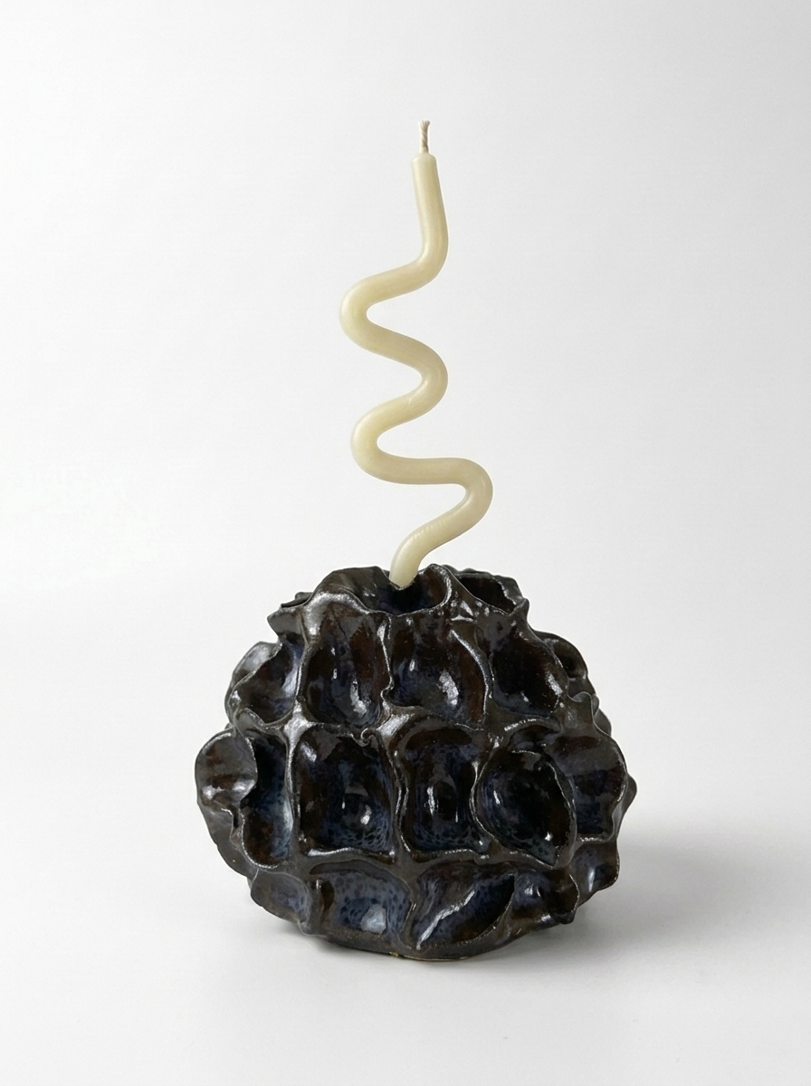 Фиолетовый подсвечник из серии «МОХ». Подсвечник для тонких свечей или благовоний. Создан в авторской технике. Каждая лунка вручную лепится художницей. Серия подсвечников «МОХ» фиксируют память прикосновения, подобно мху, который на мгновение сохраняет след касания. В состав глазурей, которые используется на подсвечниках, добавлено винтажное советское стекло, создающее непредсказуемые эффекты за счет своего химического состава.