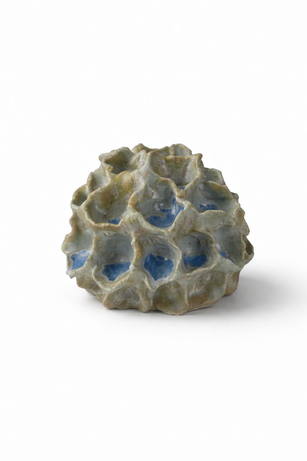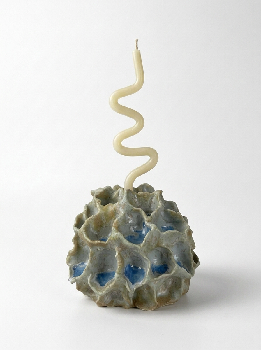 Серый подсвечник из серии «МОХ». Подсвечник для тонких свечей или благовоний. Создан в авторской технике. Каждая лунка вручную лепится художницей. Серия подсвечников «МОХ» фиксируют память прикосновения, подобно мху, который на мгновение сохраняет след касания. В состав глазурей, которые используется на подсвечниках, добавлено винтажное советское стекло, создающее непредсказуемые эффекты за счет своего химического состава.