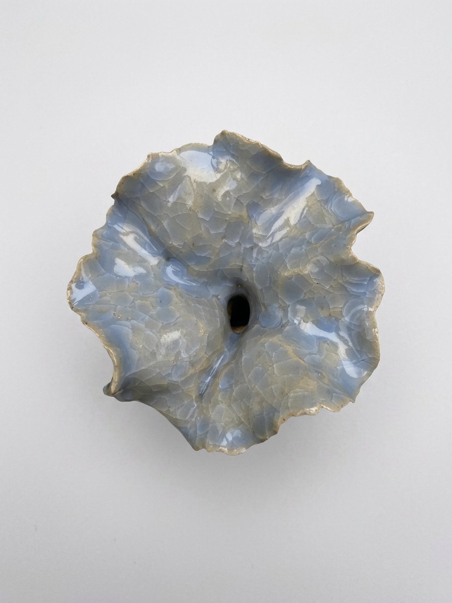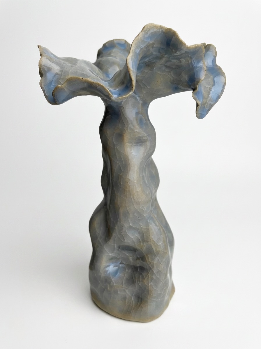 Ваза из серии «Фантастические цветы». Серия работ «фантастические цветы» создана из белой глины и покрыта авторскими глазурями. Горлышко вазы повторяет форму лепестков, имея очень тонкий край, который напоминает фарфор. Вазу можно использовать в качестве подсвечника или для одного цветка.