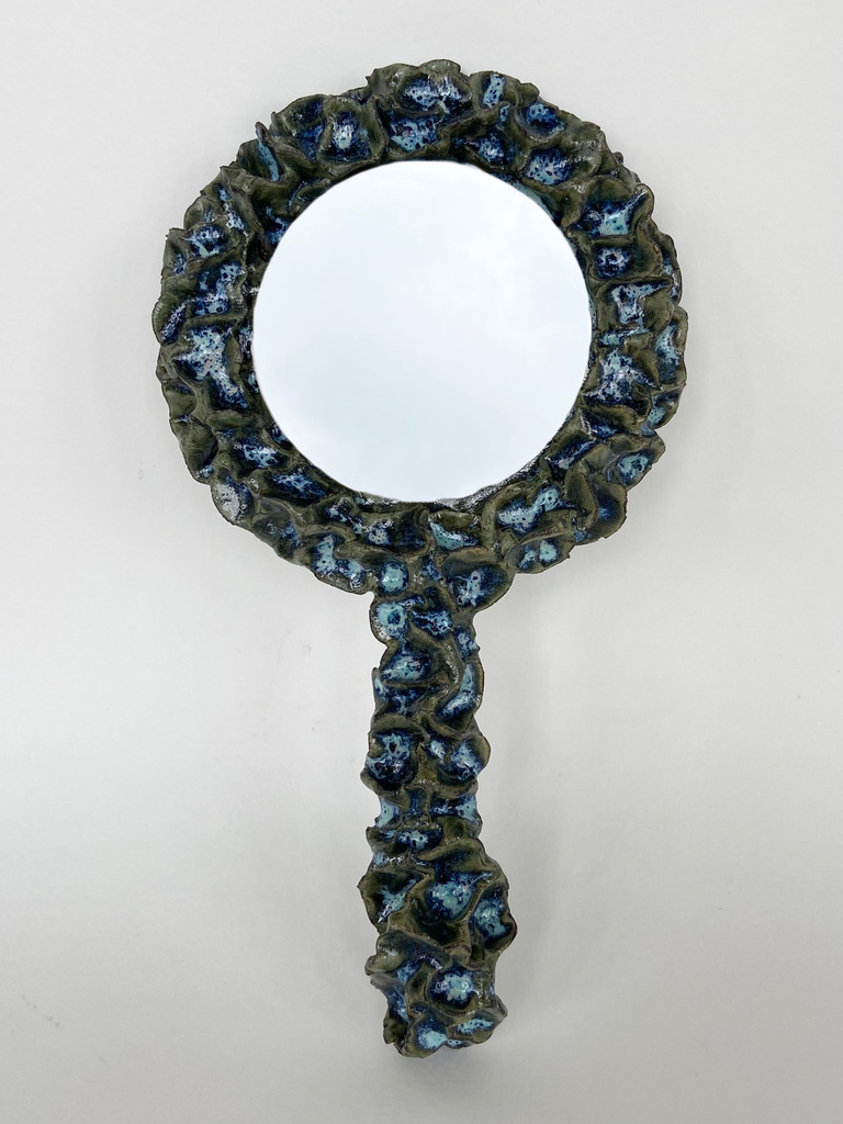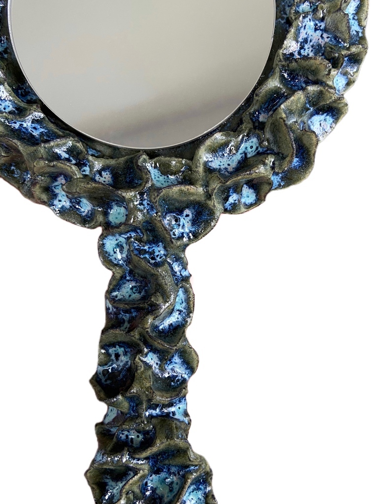 Серия миниатюрных настенных зеркал «МОХ» фиксирует память прикосновения, подобно мху, который на мгновение сохраняет след касания. В состав глазурей, которые используется на раме зеркал, добавлено винтажное советское стекло, создающее непредсказуемые эффекты за счет своего химического состава.